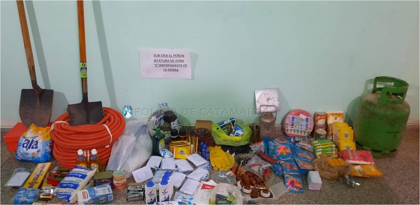 En domicilios ubicados en la localidad de El Peñón, los policías lograron recuperar una garrafa de gas verde de 10 Kg., dos palas, un reloj de pared, un gato hidráulico, medicamentos, elementos de plomería y electricidad, varios alimentos no perecederos y golosinas, elementos de limpieza que quedaron en calidad de secuestro.