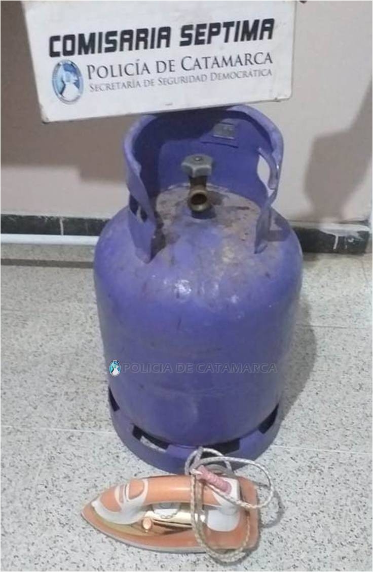 Este joven fue sorprendido llevando una garrafa de gas de 10 Kg., de color morado, y una plancha, de colores blanco y anaranjado, de dudosa procedencia, que quedaron en calidad de secuestro.