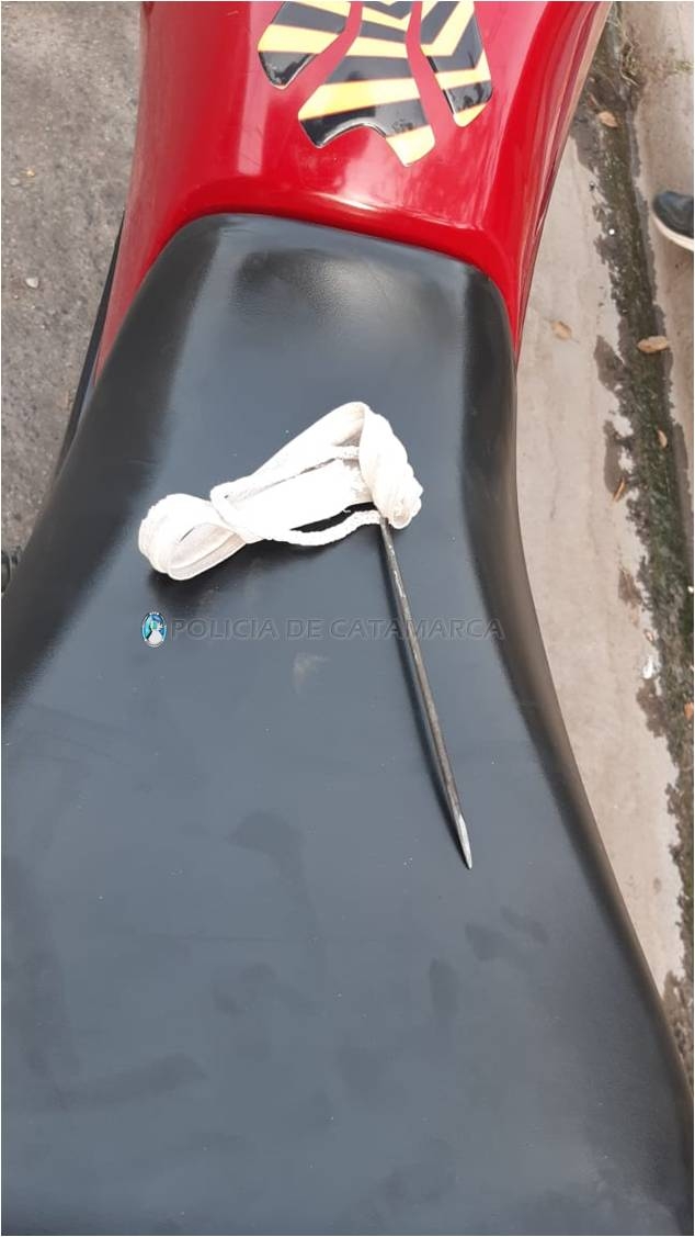En el lugar, procedió al arresto de un hombre de apellido Ontivero (41), quien circulaba en una motocicleta Honda CG Titán 150 cc., de color rojo que, tras identificarlo y al realizarle la requisa correspondiente, los policías encontraron entre sus prendas de vestir un rayo de rueda de motocicleta, que habría sido modificado como una punta, el cual quedó en calidad de secuestro.