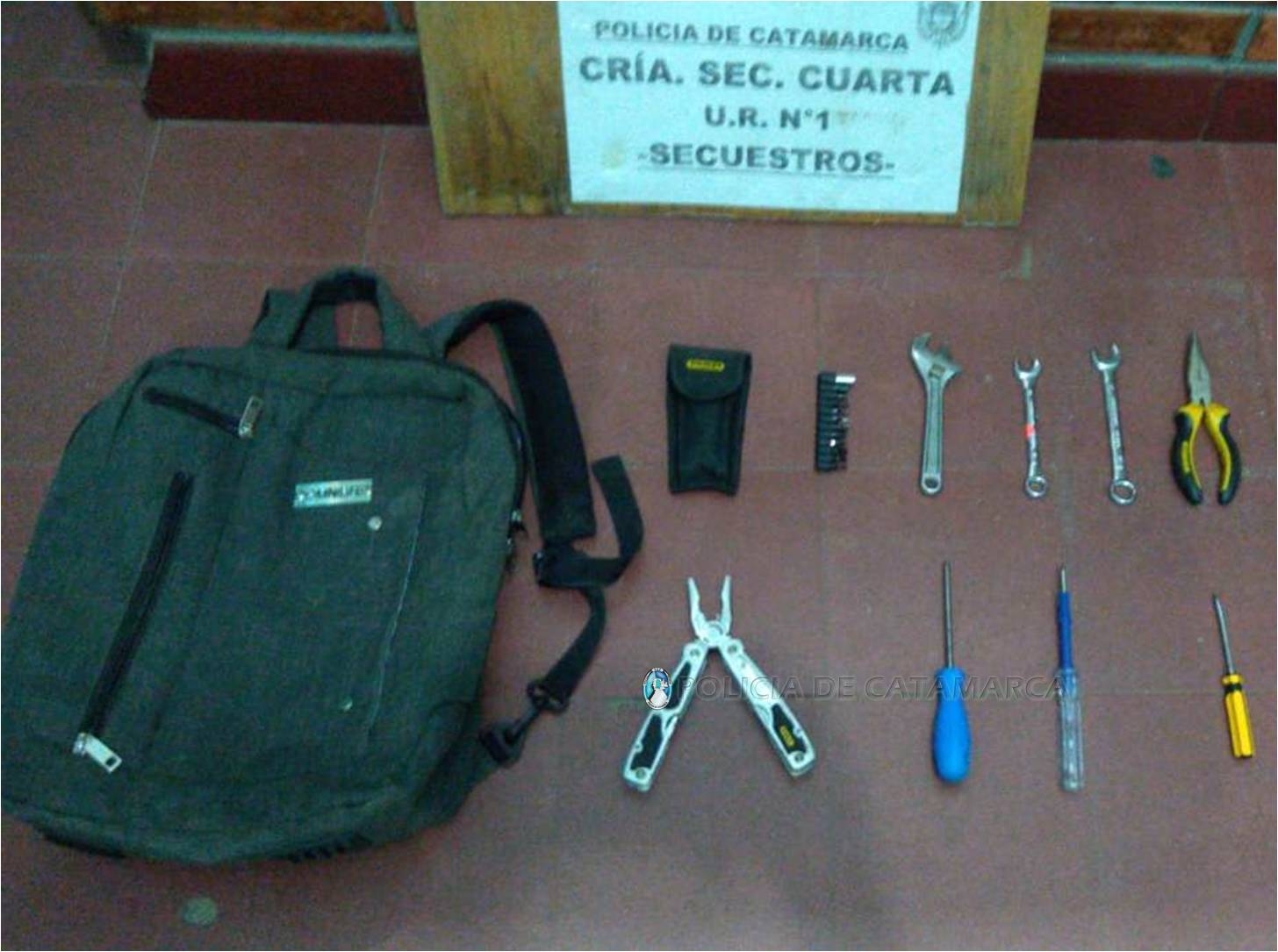 Este sujeto, momentos antes, habría ingresado al interior de un domicilio de la calle Sarmiento al 100, propiedad de un hombre de 30 años, y sustrajo una mochila negra con tres destornilladores, dos llaves combinadas, una llave francesa, una pinza de punta y un kit de pinzas multiusos con juego de tubos y torke en su respectivo estuche, para luego emprender la fuga, siendo interceptado en el lugar antes mencionado.