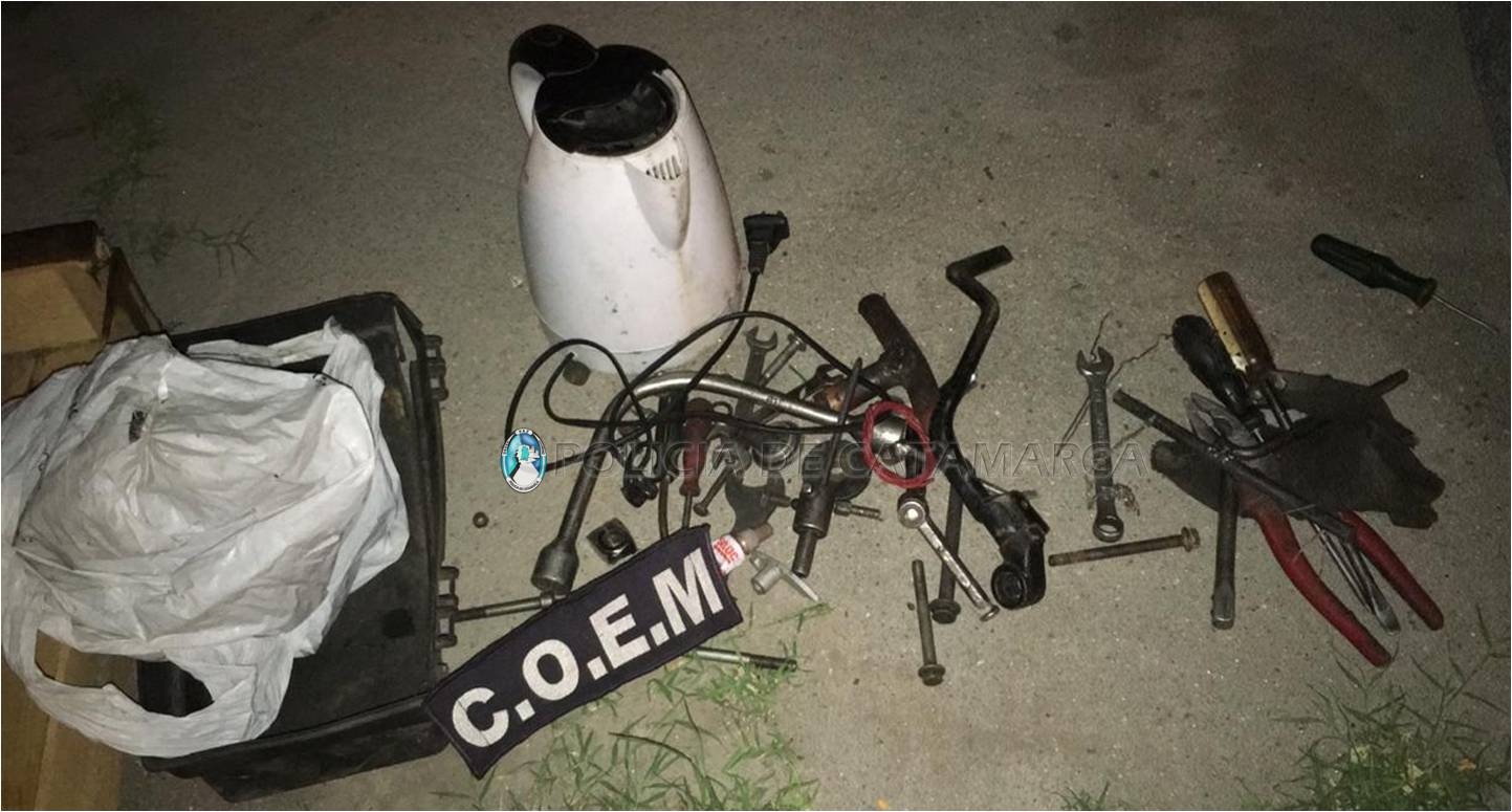 En el lugar, observaron a dos sujetos llevando elementos de dudosa procedencia, y al momento de ser identificados y practicarles la requisa correspondiente, los policías encontraron entre sus partencias una caja con herramientas varias, una pava eléctrica de color blanco, un pantalón jogging gris, y un short blanco, que quedaron en calidad de secuestro.
