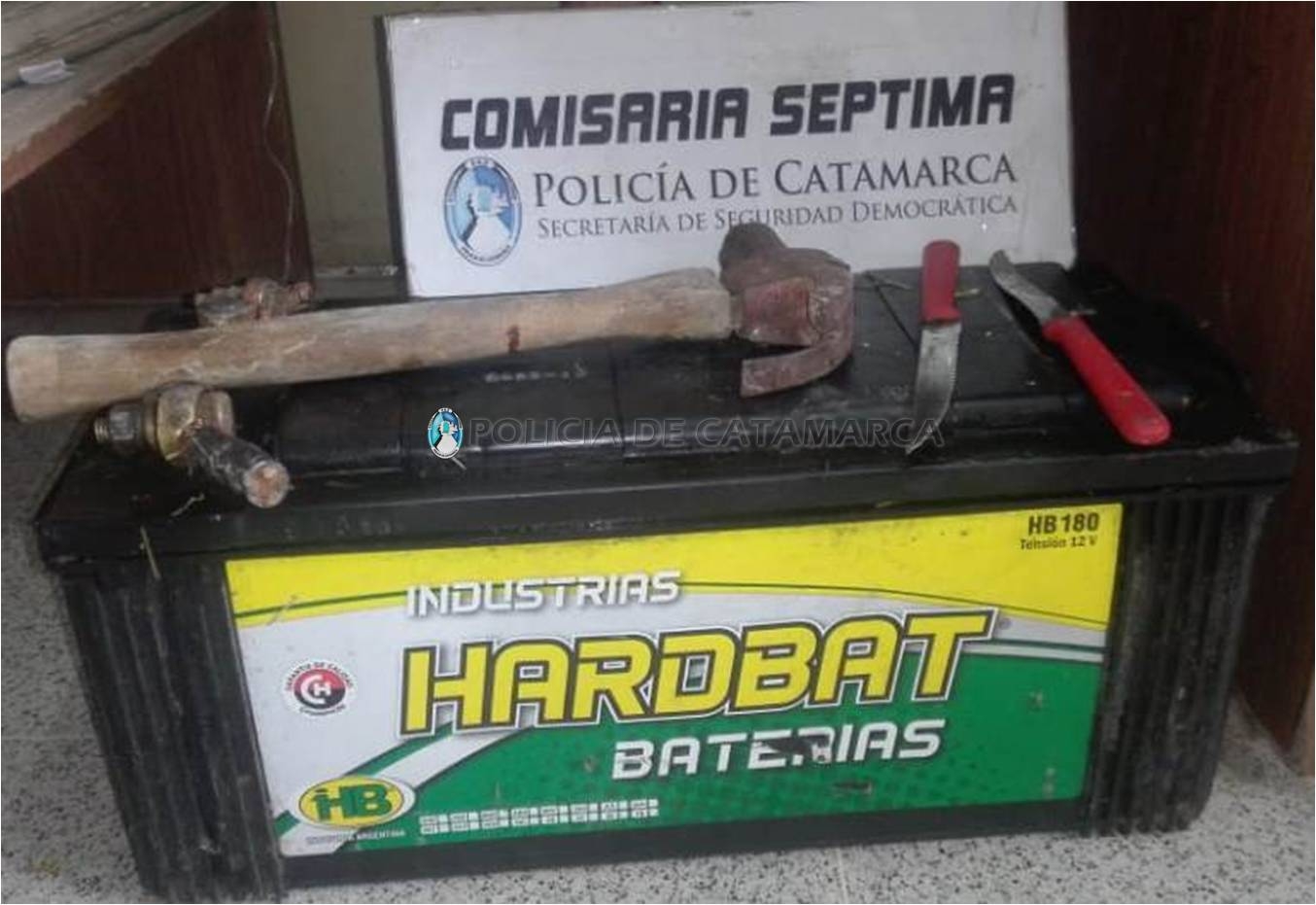 En el lugar, observó a un sujeto llevando una batería marca Harbat HB 180 tensión 12 V. de color negro, y al percatarse de la presencia policial, habría sacado de entre sus prendas de vestir un martillo con mango marrón e intentó agredir físicamente a los efectivos, no logrando su cometido.