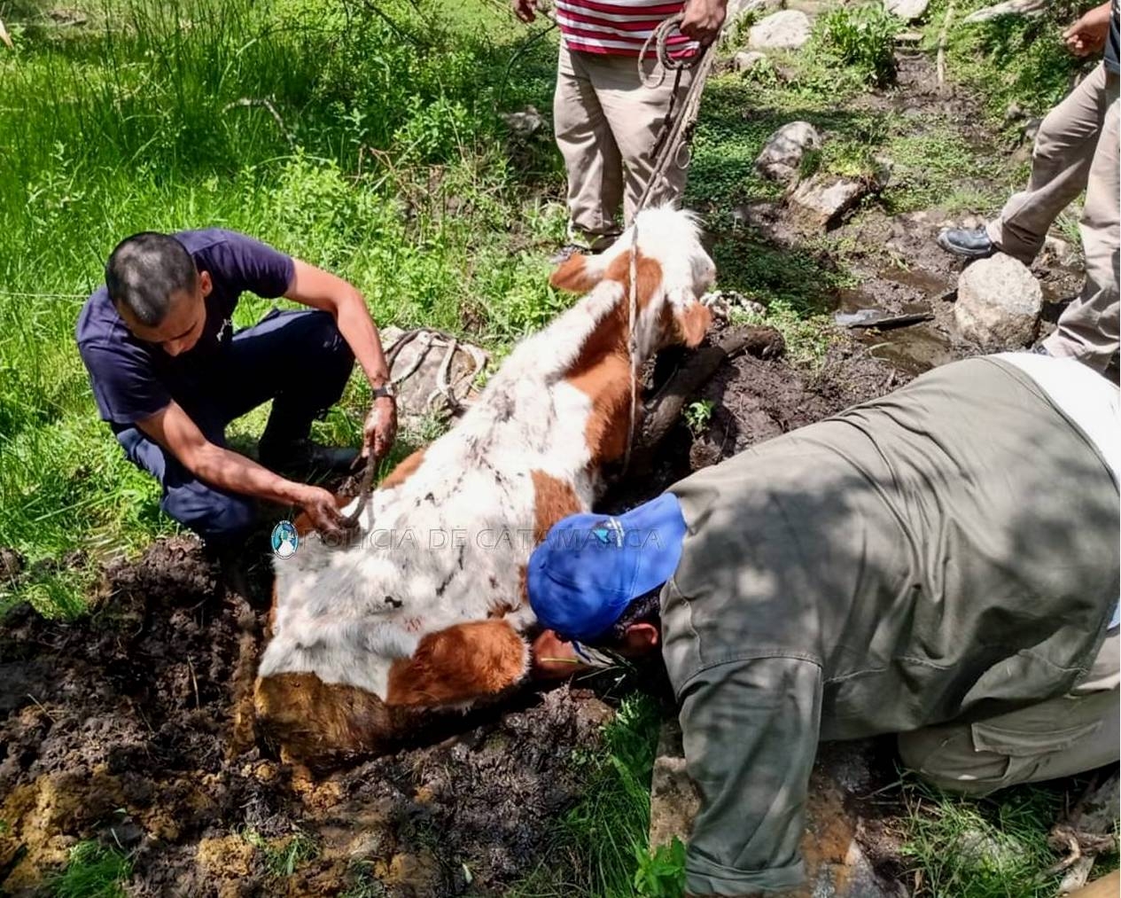 En el lugar, junto a vecinos de la zona, los efectivos policiales rescataron a un animal vacuno que estaba empantanado en una ciénaga, y por el estado del semoviente aparentemente llevaba varios días.