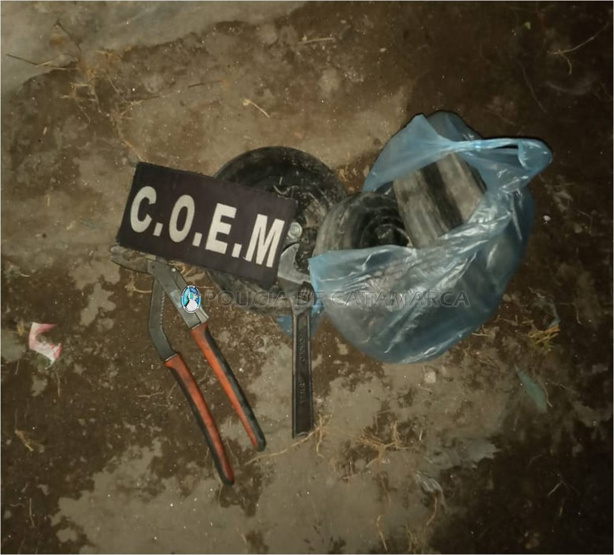 En el lugar, aprehendieron a dos sujetos de apellidos Vázquez (31) y Vázquez Vera (32), quienes habrían sido sorprendidos sustrayendo las ruedas de un contenedor de residuos ubicado en el lugar, que quedaron en calidad de secuestro, junto con una llave francesa y una pinza pico de loro.