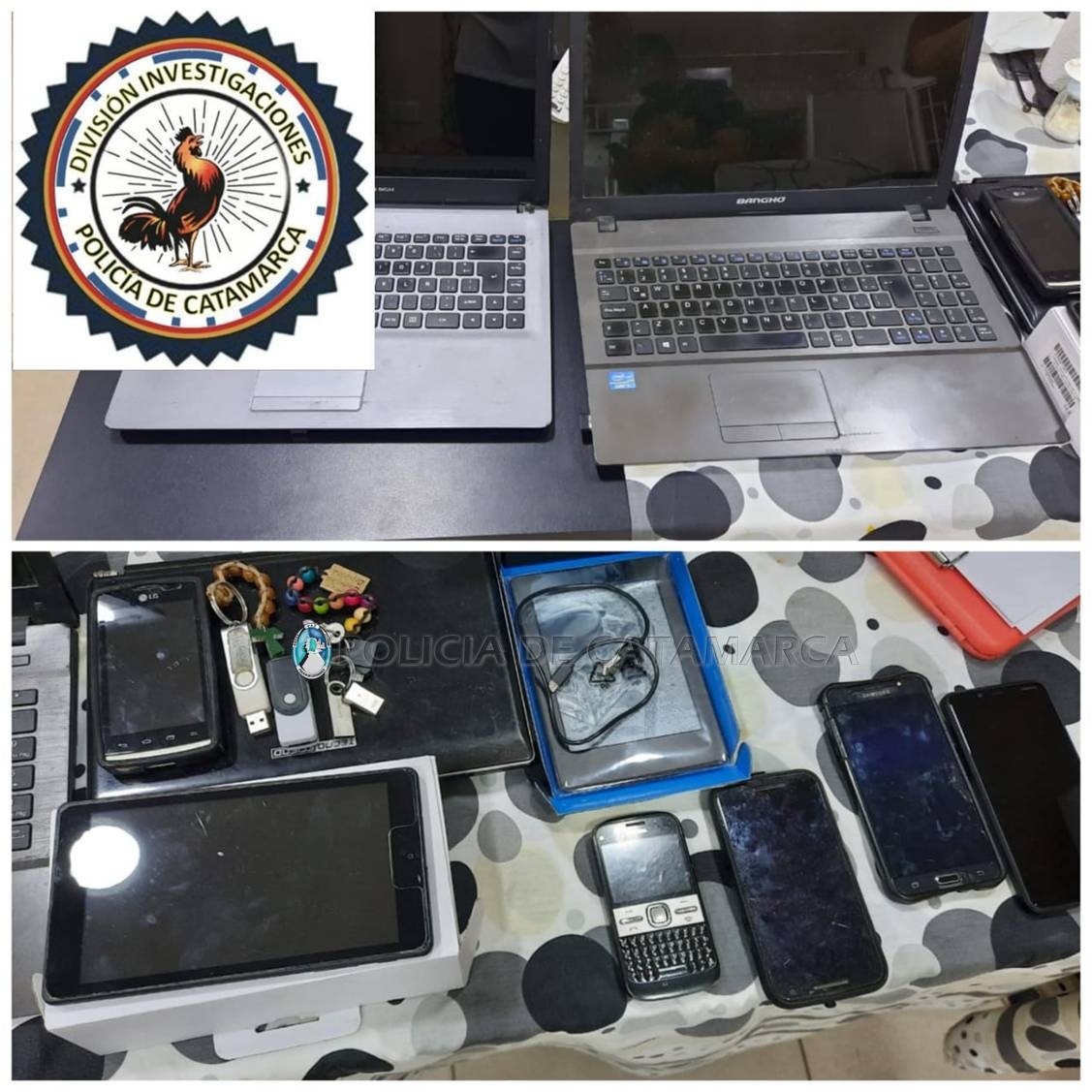 En una vivienda ubicada en la calle Padre Segura de la localidad de San Isidro, Dpto. Valle Viejo, conjuntamente con Sumariantes del Precinto Judicial mencionado, los investigadores secuestraron dos Notebook marca Bangho y Positivo BGH, cuatro pendrives, dos tablet de 7 pulgadas, un teléfono celular LG, dos teléfonos celulares marca Nokia, un teléfono celular Motorola G-3, y un teléfono celular Samsung, en el marco del hecho que se investiga.