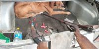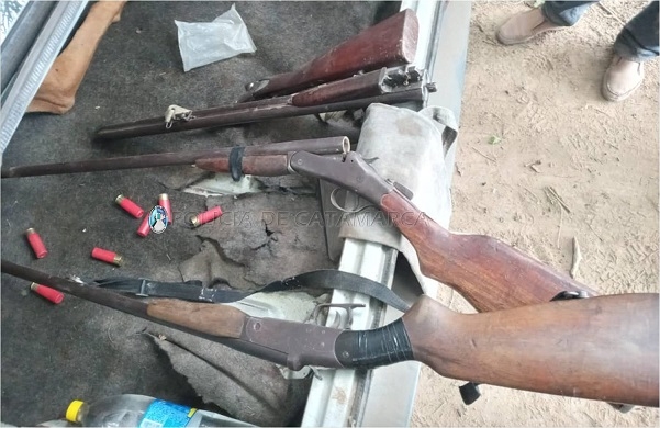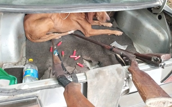 Al intentar identificar a los ocupantes, dos de ellos descendieron rápidamente del rodado y emprendieron la fuga a pie, en tanto que el restante, de apellido Amaya (40), oriundo de la Provincia de Tucumán, fue aprehendido en el lugar, donde incautaron tres armas de fuego calibre 16, siete cartuchos del mismo calibre y un perro de raza Lebrel, al igual que el vehículo.