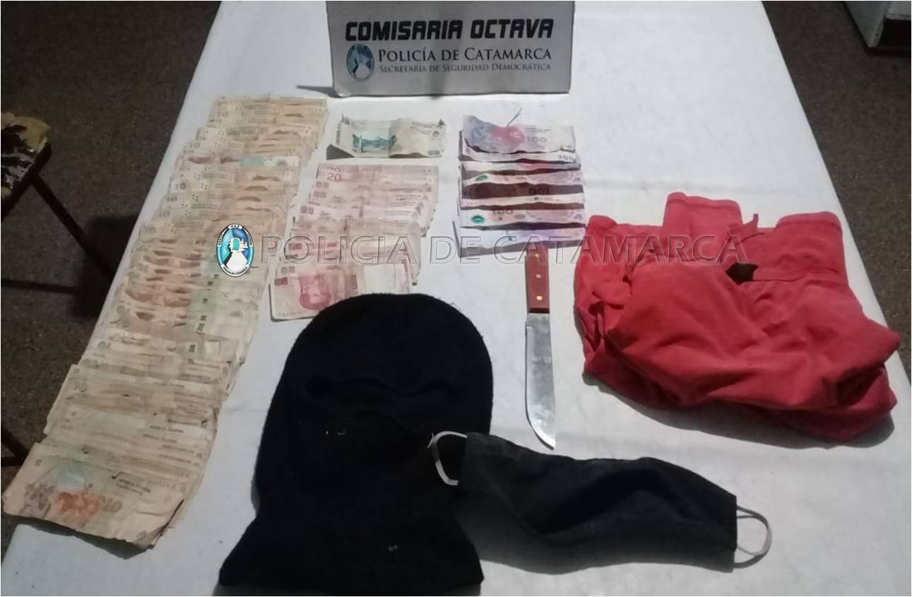 Finalmente, se dio intervención a sus pares de la Seccional Octava, que por jurisdicción corresponde, quienes llegaron al lugar y secuestraron la suma de 1510 pesos en efectivo, un arma blanca, una prenda de vestir, un pasamontañas, y un barbijo.