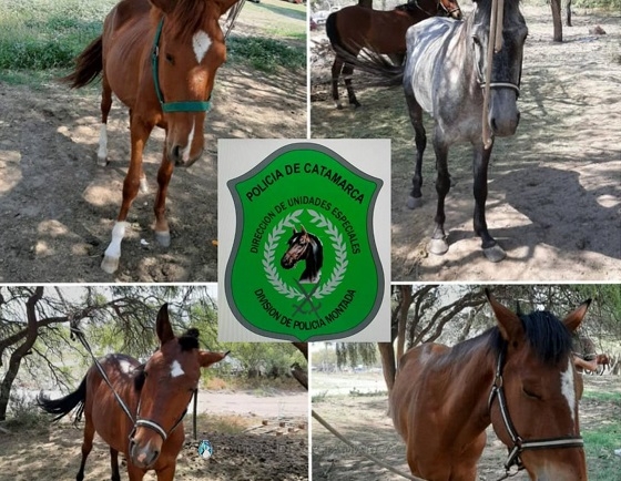 Según informó la policía, se trata de un caballo cojudo, pelaje colorado frontino pico blanco, con marca de fuego alfanumérica en pierna izquierda “EP/34”; un caballo cojudo moro negro, crin largo, sin marca de fuego visible; un potro pelaje tostado frontino, pico blanco, miembros anterior y posterior derecho blancos, sin marca de fuego visible; y un caballo doradillo listado, crin largo, miembros posteriores blancos, sin marca de fuego visible.