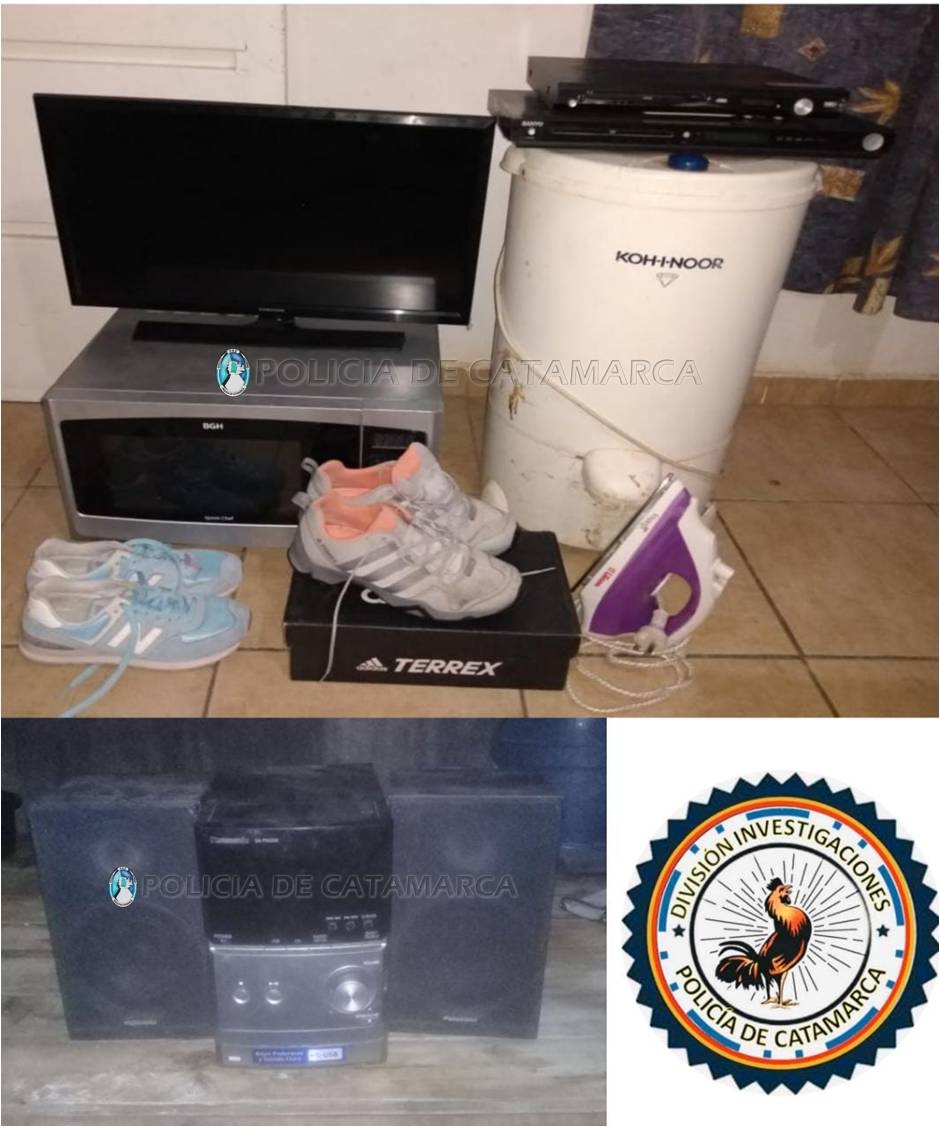 En inmuebles de la Manzana "X", del Loteo Parque Sur, propiedad de familias de apellidos Ovejero y Sarmiento, los policías lograron recuperar un secarropas Kohinoor, un microondas BGH, un televisor Samsung de 24 pulgadas, un equipo de música Pionner, dos pares de zapatillas marcas New Balance y Adidas, dos reproductores de DVD marcas Sanyo y Stromberg, y una plancha Liliana, que quedaron en calidad de secuestro a disposición de la Justicia interviniente, desde donde se indicaron las medidas a cumplimentar.