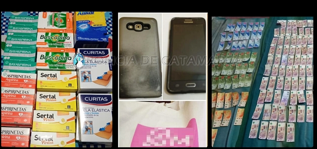 Tras una ardua tarea investigativa, personal de la División Investigaciones de la Policía de la Provincia diagramó un operativo cerrojo en inmediaciones al lugar de encuentro acordado y procedió a la aprehensión de un hombre de apellido Barrionuevo (35), y más tarde, conjuntamente con Sumariantes del mencionado Precinto Judicial, los Policías materializaron una orden de allanamiento en el inmueble del aprehendido, ubicado en el Pasaje Clero Ahumada al 100, donde lograron recuperar la suma de $48.000 en efectivo, como así también siete cajas de Aspirinetas, cinco cajas de Sertal, una caja de Alikal, cinco cajas de Bayaspirina, y cuatro cajas de Curitas, que quedaron en calidad de secuestro, al igual que un teléfono celular Samsung negro, que sería de interés para la causa.