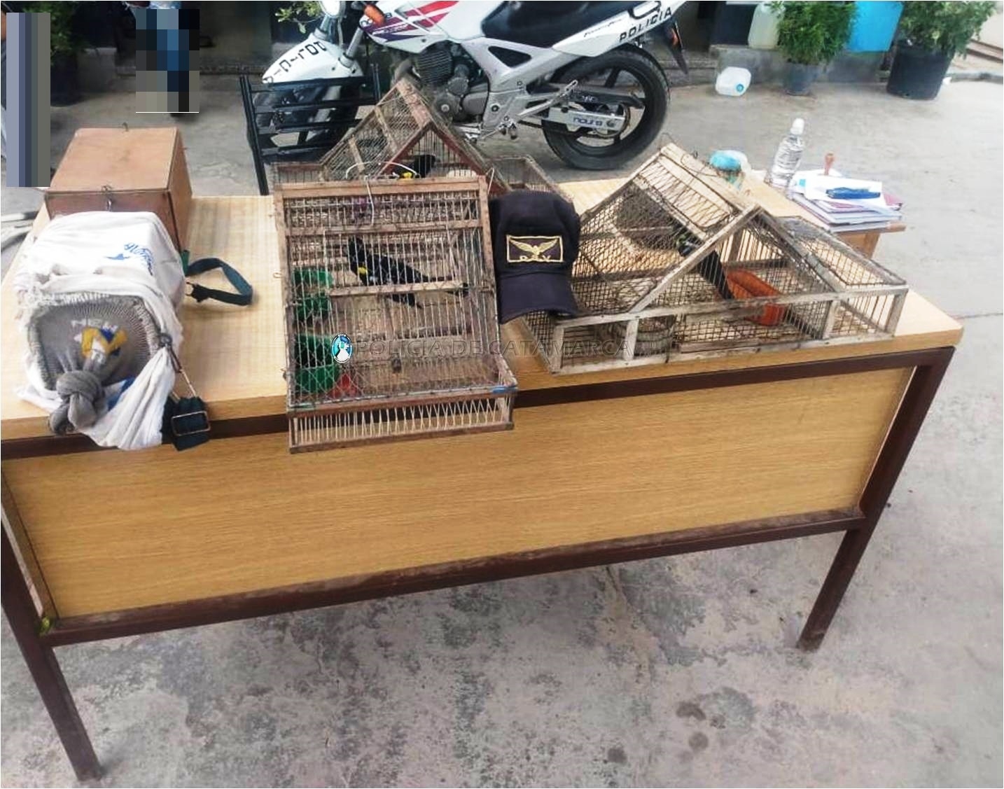 Los policías observaron que estas personas transportaban tres tramperas de red, dos transportadores, tres ejemplares de rey del bosque, y dos pichones de mirlo azul, que quedaron en calidad de secuestro.