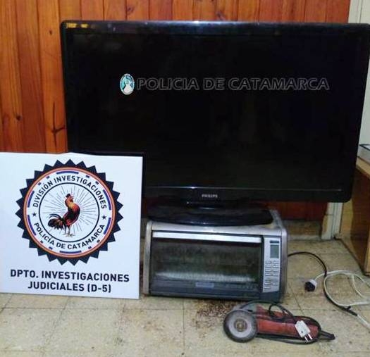 Tras una ardua tarea investigativa, efectivos de la División Investigaciones de la Policía de la Provincia llegaron hasta una plazoleta ubicada en el barrio La Viñita, donde lograron recuperar un televisor Philips 49", de color negro, un horno eléctrico plateado marca Black & Deker, y una amoladora de color anaranjado.