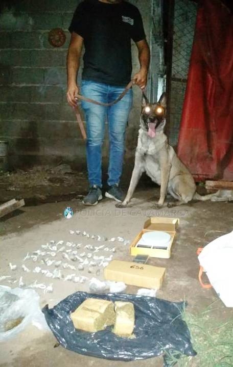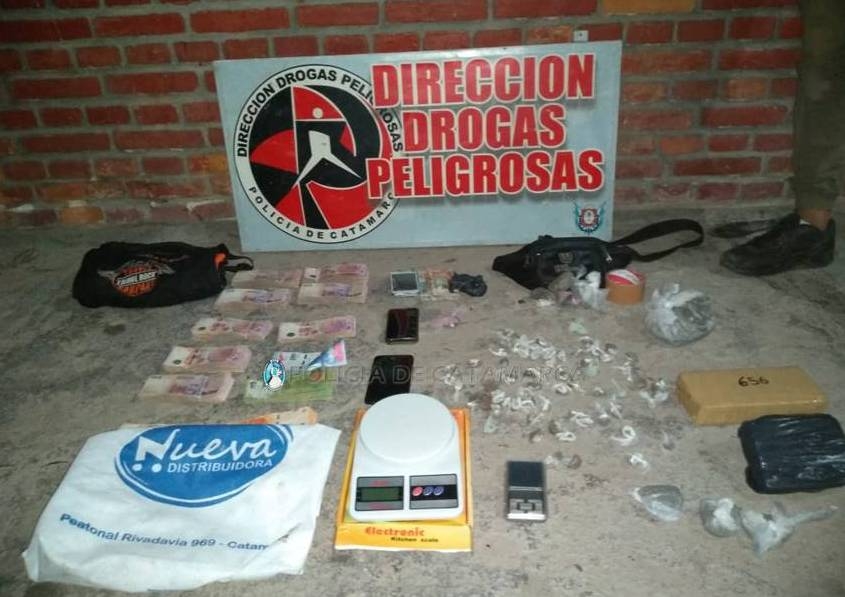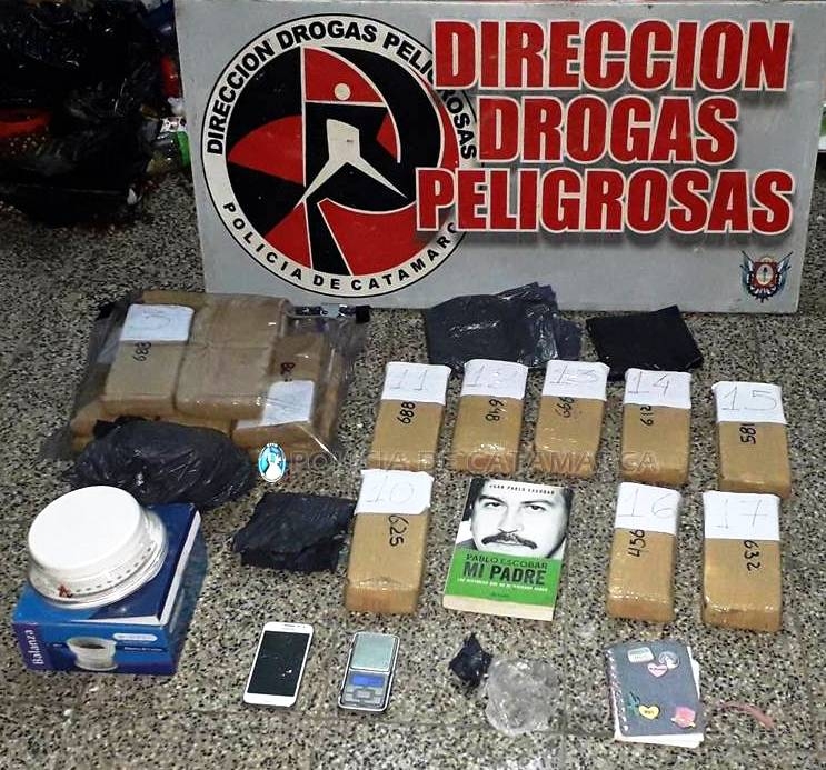 Luego de irrumpir en una vivienda ubicada en la calle N° 35 del barrio Valle Chico y en otro inmueble de la calle Zurita, entre Avenida Alem y calle 25 de Mayo, conjuntamente con personal de las Divisiones de Operaciones Especiales Kuntur y Canes de esa Dirección, los policías incautaron 18 panes de marihuana, que arrojaron un peso de 13,681, y dosis listas para ser comercializadas de la misma sustancia, teléfonos celulares de distintas marcas y modelos, tres balanzas, un libro autoría del hijo de Pablo Escobar Gaviria, un automóvil Peugeot 206, y la suma de 179.000 pesos en efectivo.