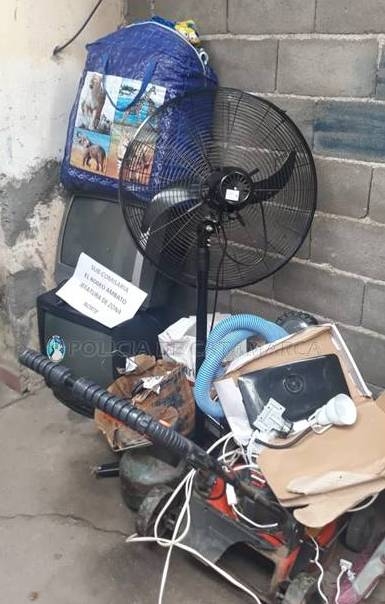 En el lugar, observaron una hormigonera roja, dos televisor marcas LG y Sanyo, de color negro, de 20 pulgadas, un control remoto Sanyo, tres botellas de cerveza, un caloventor marca Magiclik blanco, un ventilador industrial de pie AXE, de color negro, una cortadora de césped con su depósito de plástico, una garrafa de gas con anafe de 3 Kg., una bomba de agua purificadora marca Bulcano con manguera azul, una luz de emergencia, un caloventor conexión a gas con su respectivo motor, cinco acolchados, dos colchas, dos juegos de sabanas, dos prendas de vestir, cuatro pares de zapatos, ocho toallas, un estuche con cinco CD´S, un prolongador de corriente blanco de 20 metros aproximadamente, un casco de motocicleta de color negro, y dos gorras, que estaban abandonados en el lugar.