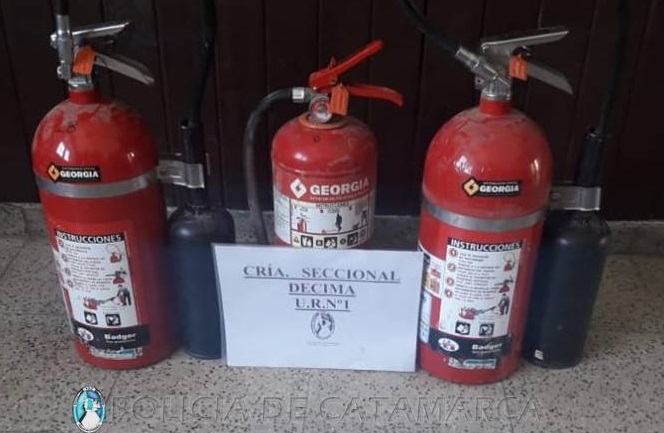 Los efectivos, procedieron a la aprehensión de un joven de apellido Vega (26), quien quedó alojado en la dependencia policial, a disposición de la Fiscalía de Instrucción en turno, desde donde se impartieron las medidas a seguir, y luego de realizar averiguaciones los policías lograron establecer que los matafuegos habrían sido sustraídos de la estación de rebaje del Barrio 9 de julio, por lo que se invitó al encargado del lugar a denunciar el hecho en el Precinto Judicial N' 3.