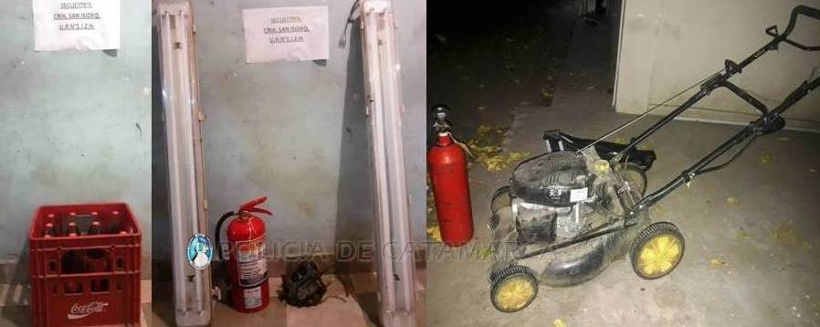 Los policías realizaron un rastrillaje por la zona y, entre la maleza de un descampado, encontraron ocultos una máquina de cortar césped de color verde, un matafuego rojo, un cajón con 10 gaseosas, dos lámparas, un extinguidor de fuego, y un carburador de moto, que quedaron en calidad de secuestro.