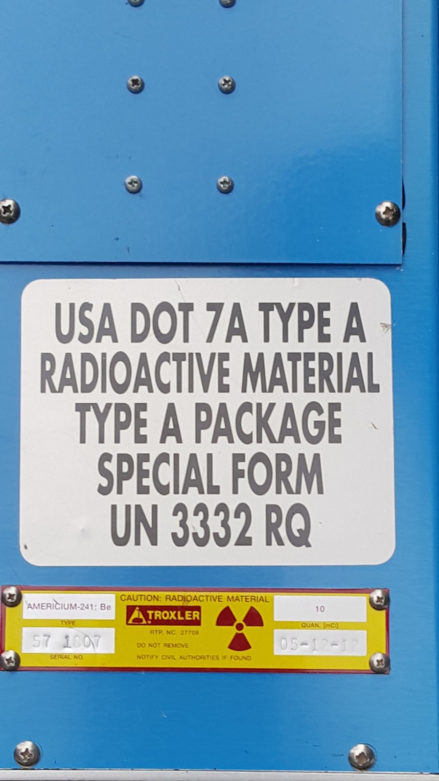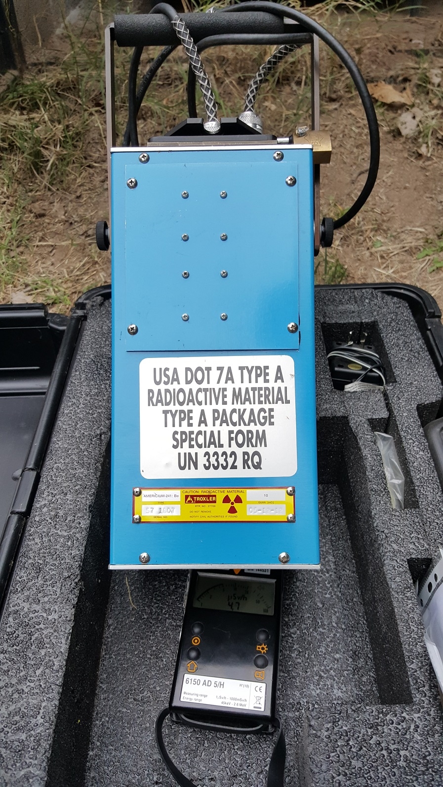 El equipo, que se emplea para realizar prácticas de medición de humedad de suelos, utilizado en obras viales, no representa riesgos mientras sea operado por especialistas, o su fuente radiactiva permanezca en el interior del mismo. Pero en el caso de ser manipulada por personas inexpertas podría provocar daños a la salud.