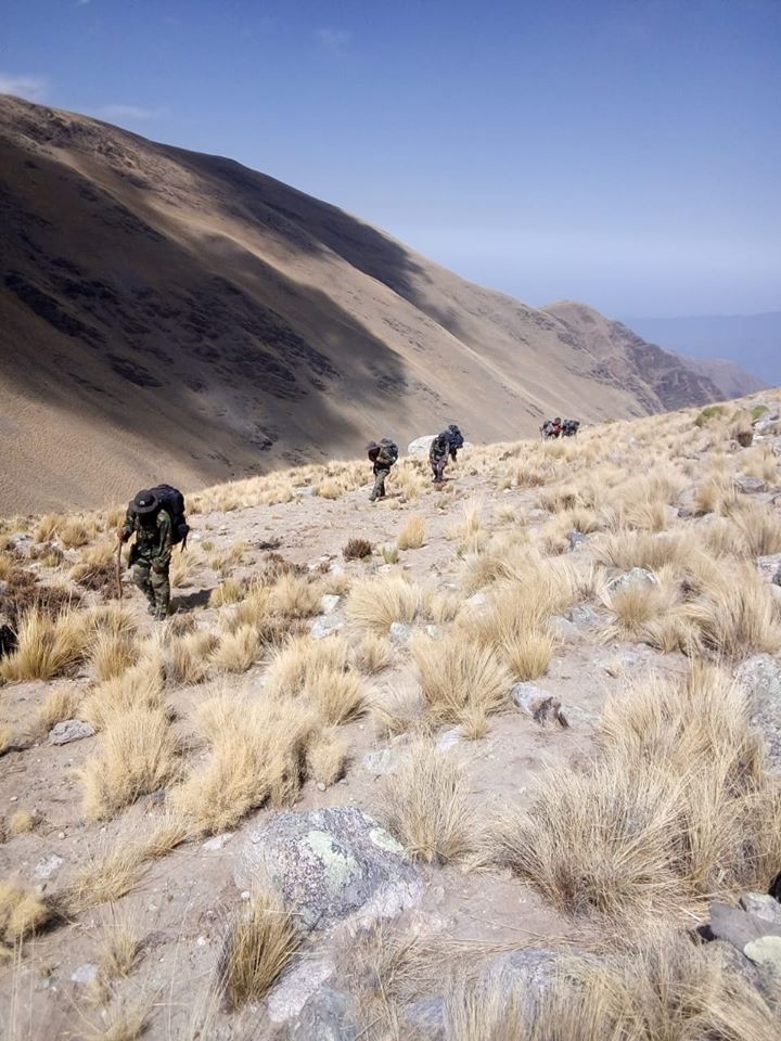Comenzamos a ascender los faldeos de la loma bola, muy duras trepadas hasta que llegamos a un filo desde donde se apreciaba en su plenitud los faldeos de los cerros más altos y ahora se sumaba el “Dos Lagunas” o de “Los Cóndores”; hasta allí nos acompañaron los Baquianos, un descanso, indicaciones varias y el abrazo de despedida: ellos regresaron por la misma senda y nosotros continuamos, todo bajo nuestra responsabilidad para orientarnos y seguir la senda más apropiada, luego de una nueva planificación en torno a lo que se apreciaba al alcance de nuestra vista, caminos o sendas únicos para pasar de un filo a otro, no hay espacio para equivocarse, profundas quebradas y peñas cerradas y largos desfiladeros.