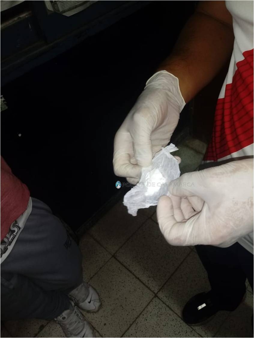 Luego de realizarle la requisa correspondiente, los policías encontraron entre sus prendas de vestir una etiqueta de cigarrillos, que en su interior contenía un envoltorio de nylon, con una sustancia de color blanco.