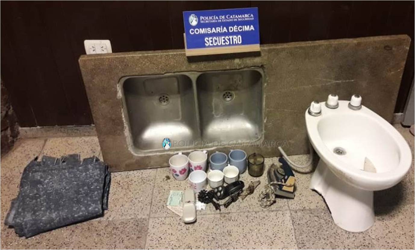 En el lugar, el personal policial interviniente secuestró una mesada con dos bachas de acero inoxidable, un bidet blanco con su respectiva grifería, una plancha, una máquina de afeitar eléctrica, seis tazas de loza, dos controles remotos para aire acondicionado, una cortina de ventana, de color celeste, un vaso de vidrio y documentación varia, que quedaron a disposición de la Fiscalía de Instrucción en turno.