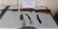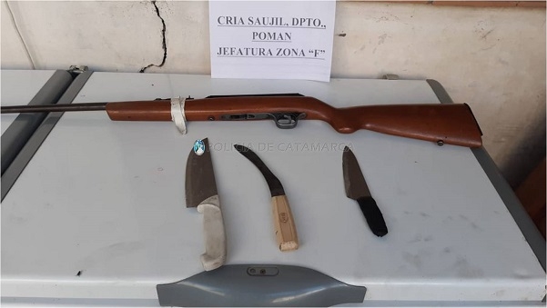 Tras irrumpir en domicilios de la calle Esquiú Sur, del barrio San Cayetano y de una calle pública, de la localidad de Saujil, propiedad de las familias Moya, Atencio, y Gonzalez, el personal policial interviniente procedió al secuestro de dos balanzas, dos Freezer Bambi blancos, que en su interior contenían doce cortes de carne vacuna, una máquina de picar carne, una sierra eléctrica sin fin, un torzal de cuero trenzado, tres cuchillas, un rifle calibre 22 y 18 ganchos de acero para colgar carne.