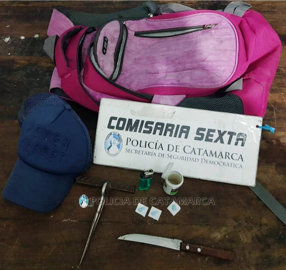 Los policías aprehendieron a dos jóvenes de apellidos Páez (23) y Sosa (25), y durante la requisa correspondiente, encontraron en el interior una mochila de color rosado, propiedad de uno de ellos, un cuchillo tipo tramontina, un frasco con tres pastillas de alprazolam, y una gorra azul, que también fueron incautados.