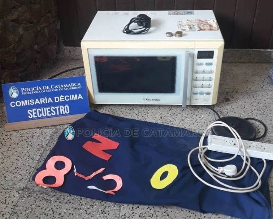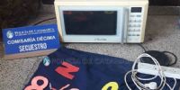 Al percatarse de la presencia policial, emprendió la fuga arrojando a la cinta asfáltica una tela de color azul, en la que llevaba un microondas blanco manca Electrolux, una zapatilla prolongadora de corriente eléctrica, de color blanco, diez gaseosas y golosinas, una base para pava eléctrica, un cargador negro de teléfonos celulares y dinero en efectivo, que quedaron en calidad de secuestro.