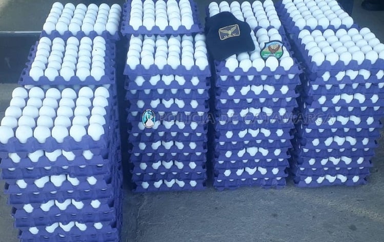 Asimismo, hoy a las 14:05, en el mencionado puesto de control, los policías hicieron lo propio con un automóvil Renault Megane, de color negro, conducido por una mujer de 43 años de edad, y observaron que transportaba 108 cartones de huevos, sin el correspondiente rótulo, carnet sanitario, y la debida habilitación del medio de transporte, en virtud de lo cual se dio intervención a personal de Bromatología y de la Dirección de Rentas Municipal perteneciente al Municipio de Huillapima, quien decomisó ambas cargas previo a labrar las actuaciones de rigor.