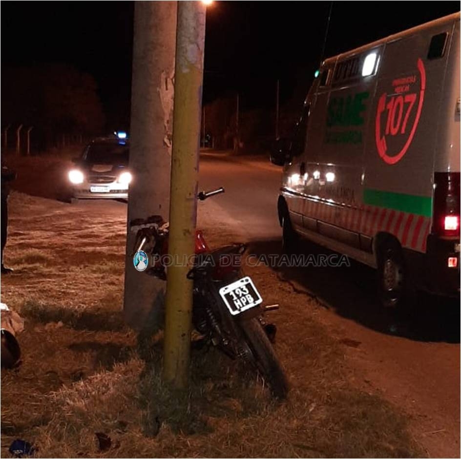 Édgar Exequiel Barrios (24) circulaba al mando de una motocicleta Motomel 150 cc., de color rojo, dominio 193-HPB, y por motivos que se tratan de establecer, perdió el control del rodado, derrapó y chocó contra un poste del alumbrado público, sufriendo lesiones que demandaron que fuera asistido por facultativos médicos del SAME y posteriormente trasladado al Hospital San Juan Bautista de esta Ciudad Capital.