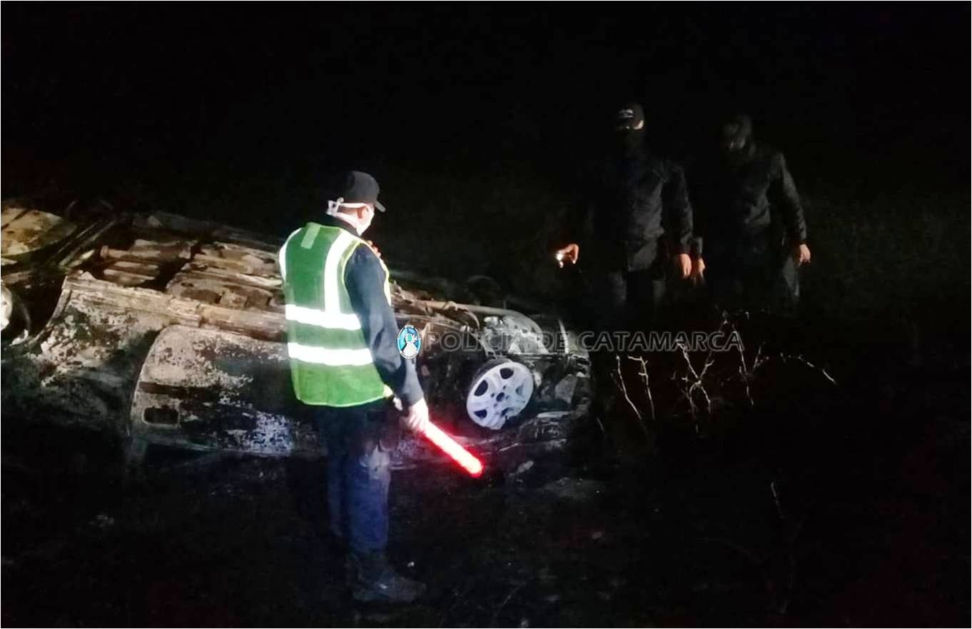 De inmediato, personal de la Comisaría de Huillapima solicitó la colaboración de sus pares de la Dirección Bomberos de la Policía de la Provincia, quienes sofocaron las llamas que causaron daños materiales totales en el automóvil.