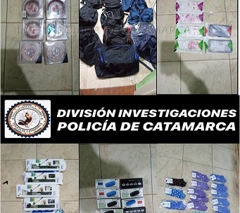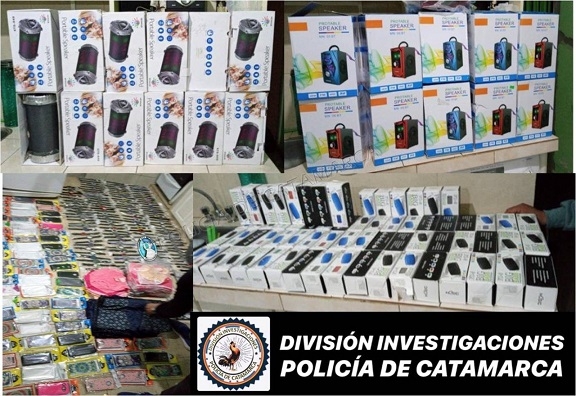 Tras realizar una minuciosa tarea investigativa, bajo las directivas de la Fiscalía de Instrucción N° 7, a cargo del Dr. Agustín Alejandro Gober, los efectivos materializaron un registro domiciliario en un domicilio ubicado en el barrio 111 viviendas norte, propiedad de una familia de apellido Perna, donde recuperaron 33 cajas de auriculares, 49 bóxer para hombre, 130 unidades de ropa interior para mujer, 67 fundas de teléfonos celulares de distintos modelos y marcas, 119 relojes de puño, 80 parlantes cilíndricos de diferentes marcas y colores, 11 parlantes cuadrados, 19 muñecas de distintos modelos, 6 packs de juguetes de doctor, 1 unicornio de juguete, 17 bolsos de colores varios, 74 cintos de cuero, 7 palos de selfies, y 184 pares de medias de diferentes colores.