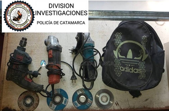 A raíz de ello, la policía realizó un allanamiento en un domicilio ubicado en la calle Tomás Vergara, de la localidad de El Bañado, propiedad de la familia Monje, donde un hombre hizo entrega voluntaria de 2 amoladoras marcas Black & Deker y Makita, 1 taladrado Skil, 3 discos de corte de 115 mm., 1 disco diamantado de 115 mm., y 1 mochila Adidas negra con letras verdes.