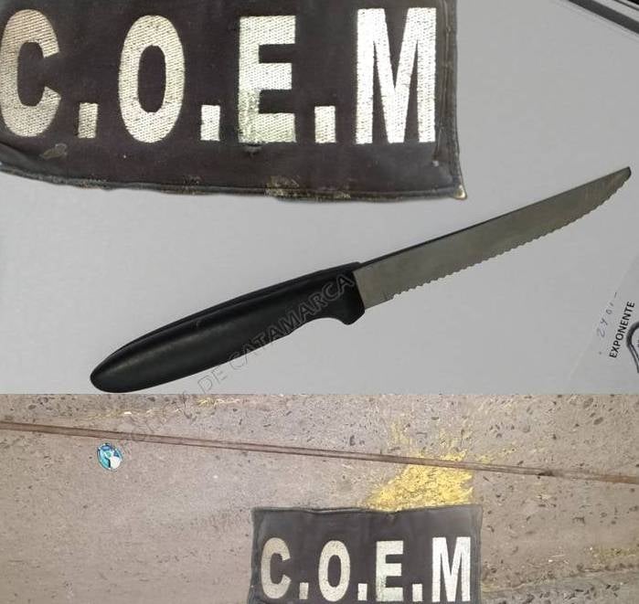 Cabe mencionar que esta persona intentó agredir físicamente con un cuchillo tipo tramontina y un hierro, que quedaron en calidad de secuestro, a dos Cabos Primeros de Policía.