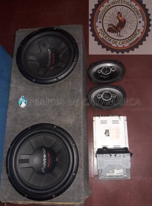 Tras realizar averiguaciones, los investigadores materializaron tres registros domiciliarios, bajo las directivas de la Fiscalía de Instrucción N° 2, a cargo del Dr. Carlos Horacio Brizuela, en distintos domicilios del departamento Valle Viejo, ubicados en la calle Padre Esquiú al 100, propiedad de la familia Toloza, donde procedieron al secuestro de una potencia PYRAMID de color blanco, de 300 watts, en tanto que en un taller de la calle Congresal Acevedo S/N° del barrio 17 de Octubre, donde reside la familia Sánchez, hicieron lo propio con dos parlantes marca Pioneer y un estéreo Sony, mientras que en una morada del barrio 20 viviendas, propiedad de un joven de apellido Luna, incautaron dos cajas acústicas con dos parlantes Pioneer (woofer).