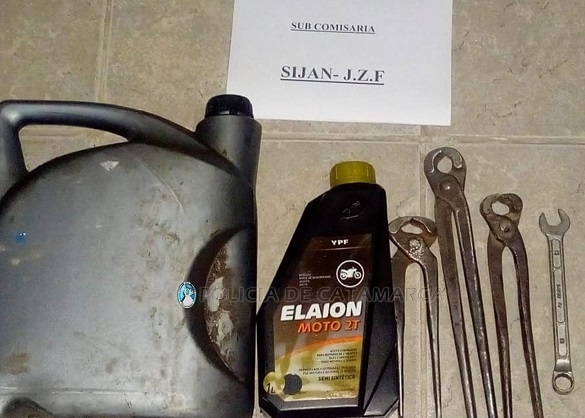 Tras llevar a cabo un registro domiciliario, bajo las directivas de la Fiscalía de la Segunda Circunscripción, en una vivienda donde reside la familia Toledo, los policías lograron recuperar tres tenazas, una llave N° 13, un bidón de aceite Elaion para moto y un bidón de 5 litros con gasoil.