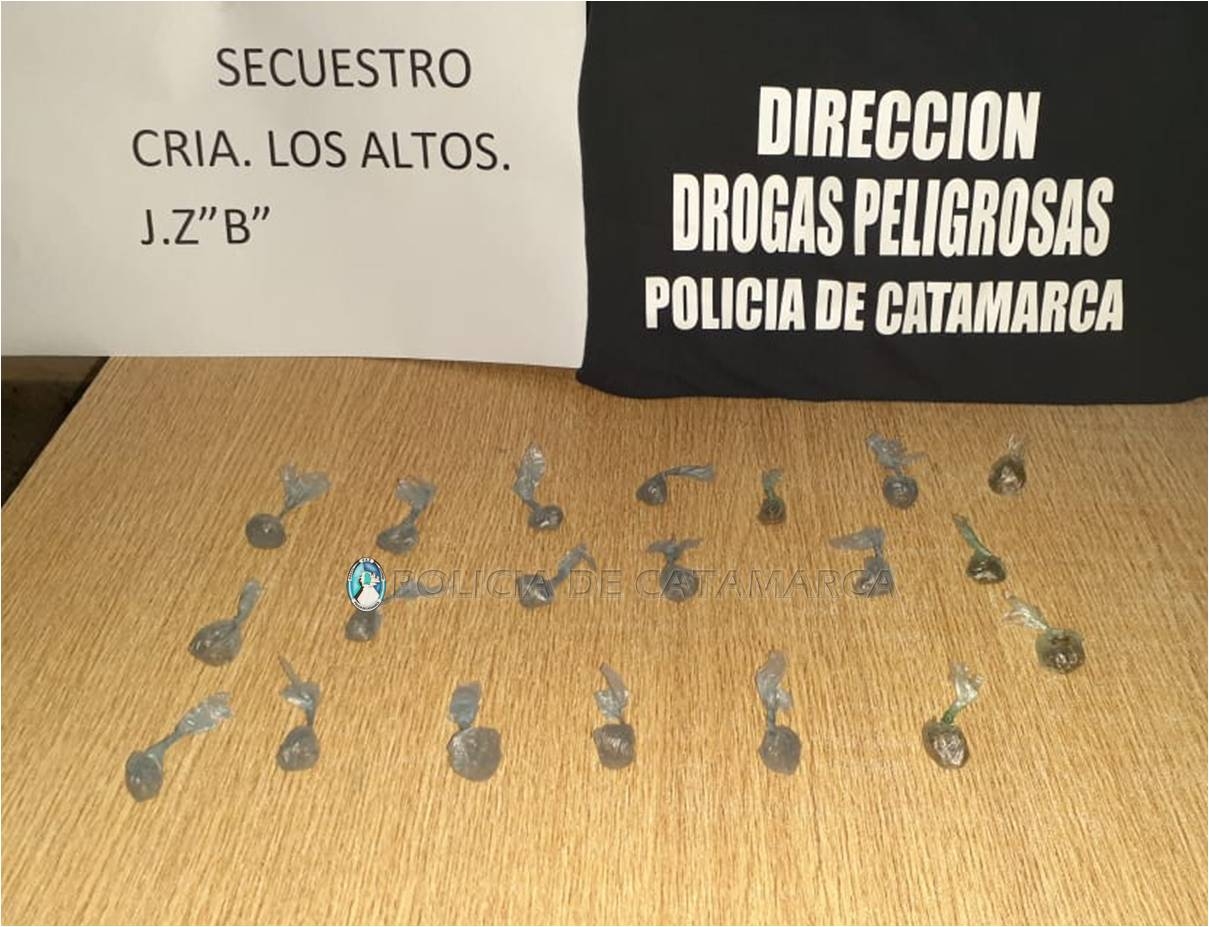 Al momento de realizarle la requisa correspondiente, los policías le encontraron entre sus prendas de vestir 20 envoltorios de nylon, que contenían una sustancia tipo herbácea.