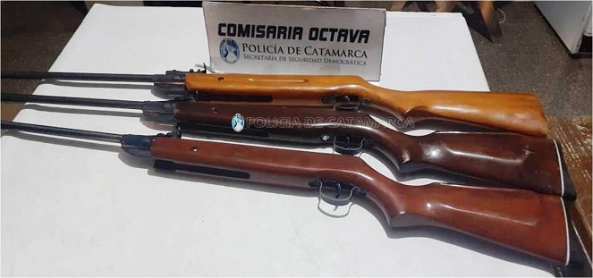 A las 17:30 de ayer, mientras personal de la Comisaría Octava realizaba recorridos de prevención por la avenida Virgen del Valle, en inmediaciones a la Gruta “Nuestra Señora del Valle”, identificaron a tres jóvenes; dos de 25 años y uno de 28, quienes fueron sorprendidos llevando tres rifles de aire comprimido Cal. 5,5, de color marrón, sin la documentación correspondiente.