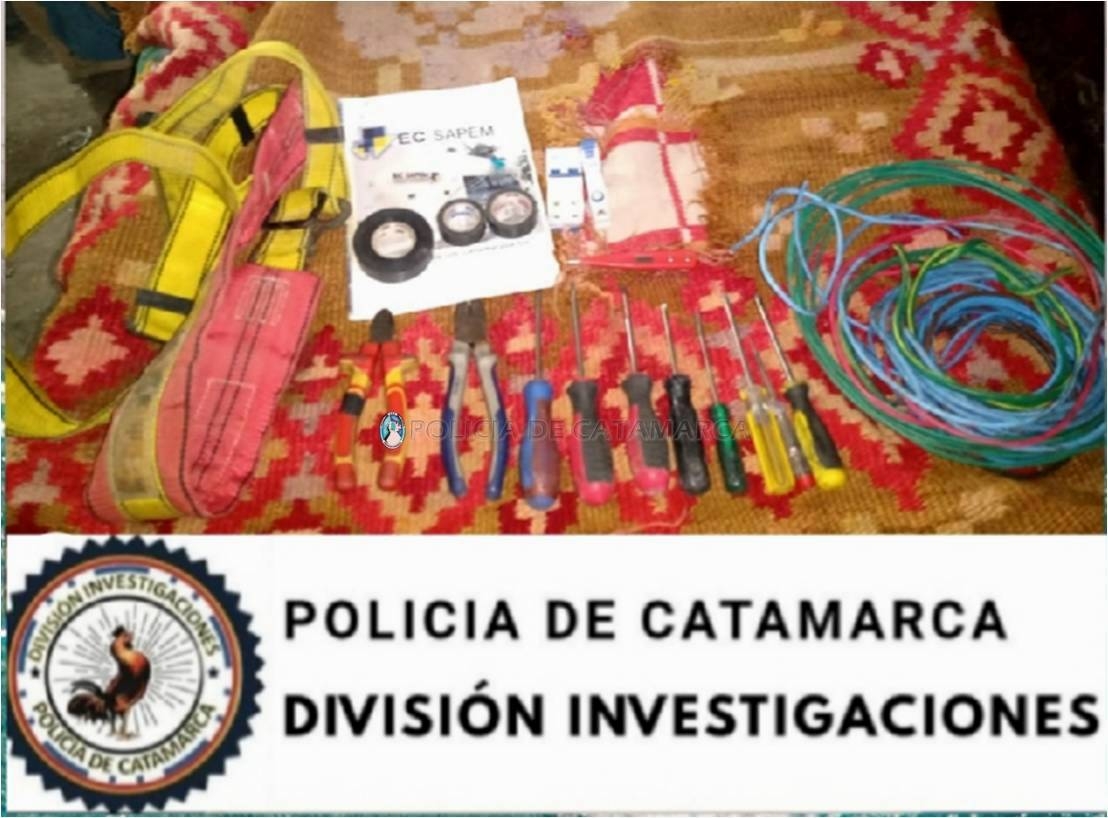En el lugar, los policías encontraron siete destornilladores de distintos tamaños, una pinza, un alicate, un busca polo, tres rollos de cables, un busca polo digital, dos llaves térmicas; una bipolar y la restante unipolar, tres cintas aisladoras de color negro, un arnés de carga y un panfleto perteneciente a la empresa.