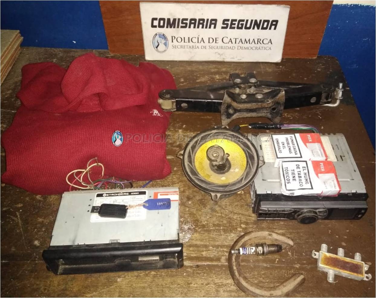 Al llegar al lugar, conjuntamente con sus pares de la Seccional Sexta, los policías observaron que un joven, al notar las unidades móviles, abandonó dos estéreos, un pendrive de 16 GB, un gato hidráulico, dos etiquetas de cigarrillos, un suéter tejido rojo, un parlante para auto, una herradura para caballos y una bujía, que quedaron en calidad de secuestro, para luego emprender la fuga.