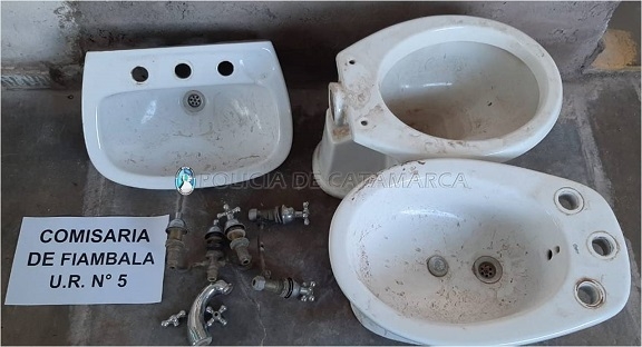 A las 8:30 de hoy, efectivos de la Comisaría de Fiambalá se hicieron presentes en el barrio San Antonio, de la localidad de Palo Blanco, donde incautaron un juego de sanitarios completo, que estaban ocultos entre la maleza de la zona.