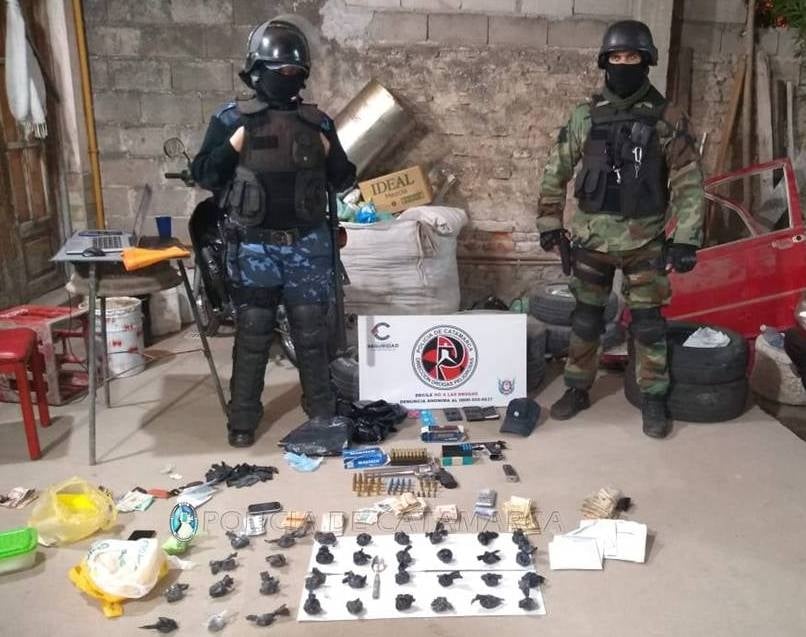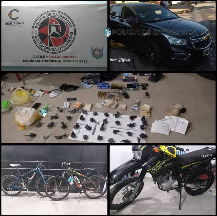 En el lugar, los policías secuestraron la suma de 174.740 pesos en efectivo, seis teléfonos celulares, un automóvil Chevrolet Cruze negro, 35 envoltorios de nylon conteniendo en su interior una sustancia tipo polvo, los cuales fueron sometido a la prueba de campo correspondiente, determinando que se tratarían de 845 grs. de clorhidrato de cocaína, dos bolsas conteniendo la misma sustancia, una cuchara, una balanza digital tipo gramera, una motocicleta Yamaha XTZ 250 cc., dos bicicletas GIANT y SLP, un revólver calibre 44 Magnum, una pistola Vereta calibre 9 mm., bolsas y recortes de nylon de diferentes tamaños, tres chip de telefonía celular de diferentes empresas, varios cartuchos calibres 22, 38 y 44 Magnum, un reproductor de DVD con su cable de alimentación, y una gorra de color negro, de interés para la causa.