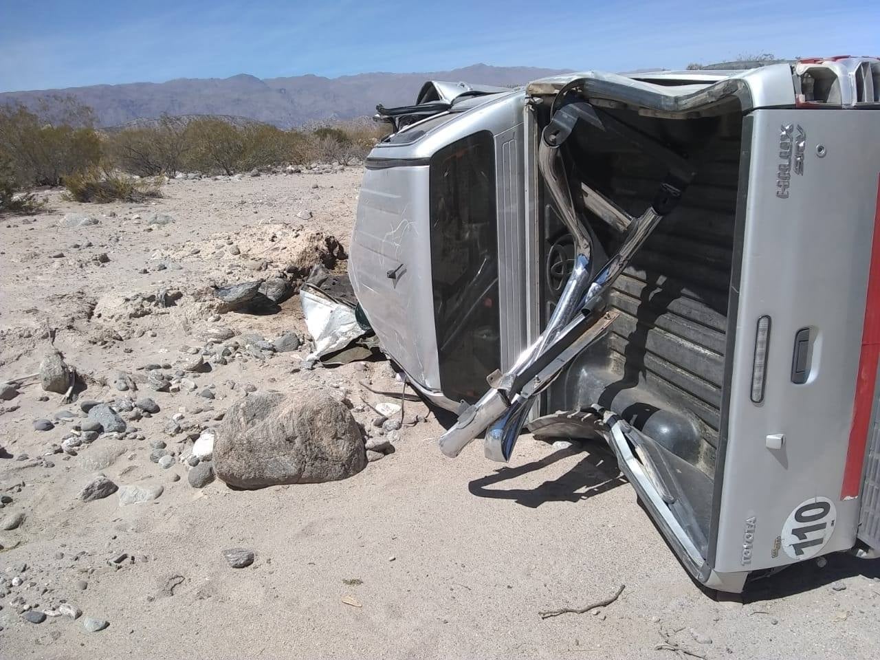 En el lugar, un joven de apellido Reinoso, de 26 años, conducía una camioneta Toyota Hilux, y por razones que se tratan de establecer, perdió el control y terminó volcando.