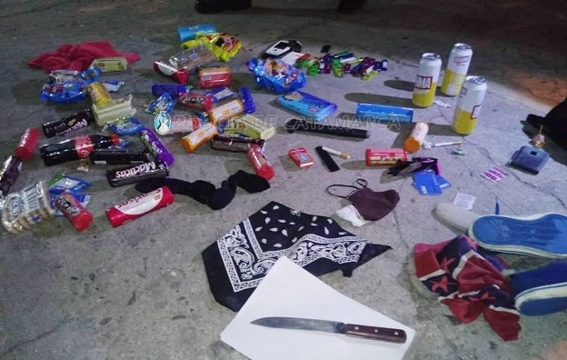 En el lugar, los Policías procedieron a la demora de tres adolescentes; uno de 14 y dos de 17 años, quienes fueron sorprendidos llevando mercadería, bebidas, encendedores, un inflador, una cuchilla, y otros elementos.