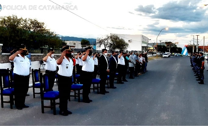 La ceremonia dio inicio con el arriamiento de nuestra Enseña Patria que se encuentra emplazada en el mástil de dicha dependencia, realizado por el Ministro de Seguridad, Gustavo Aguirre, acompañado por el Jefe de Policía, Crio. Gral. (RE) Ángel Ignacio Agüero, el Director de Unidades Especiales, José Ariel Villalba, y el Jefe de la División Guardia Infantería, Jorge Rolando Romano.