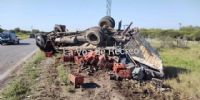 El camión Mercedes Benz, color rojo, era conducido por Alan Demaría, que aparentemente fue "rozado" por otro camión, provocando que muerda el cordón y vuelque.