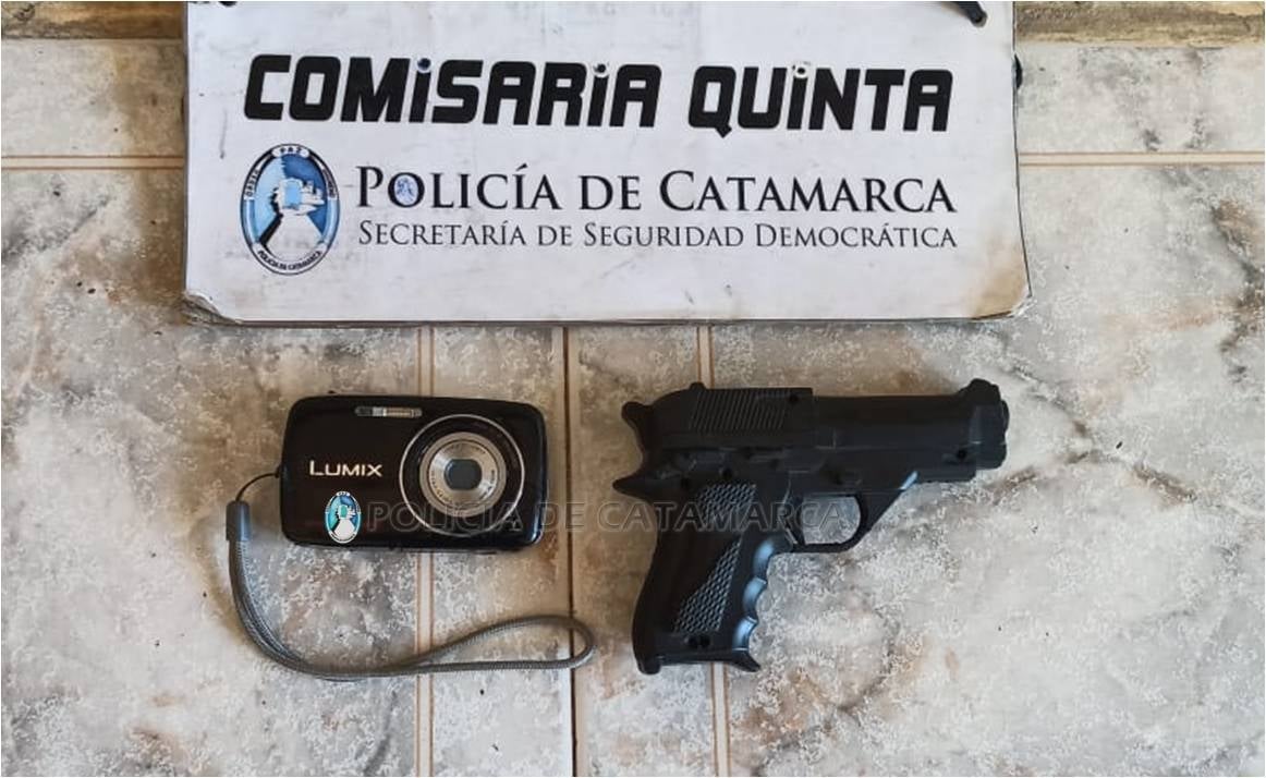 Al realizarle la requisa correspondiente, encontraron entre las pertenencias de uno de ellos, una cámara digital Lumix, de colores negro y gris, de la cual no supo acreditar la legítima propiedad, y una pistola de juguete que quedaron en calidad de secuestro.