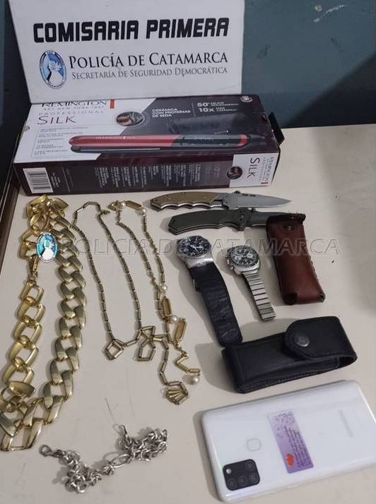 Cabe mencionar que al ser interceptado y tras realizar la requisa correspondiente, se encontró entre sus pertenencias dos cuchillos tipo navaja, dos relojes pulsera, cuatro elementos de bijouterie y un teléfono celular Samsung A21 de color blanco.