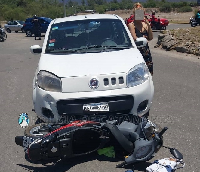 Hoy lunes a las 13:00, en la intersección de las avenidas Recalde y Fiesta del Poncho, Cintia Maria Herrera (38), que conducía junto a sus dos hijos en un Fiat Uno, colisionó con una Moto Corven Energy 110 cc; en la que circulaba Mariela Ramona Salcedo (36).