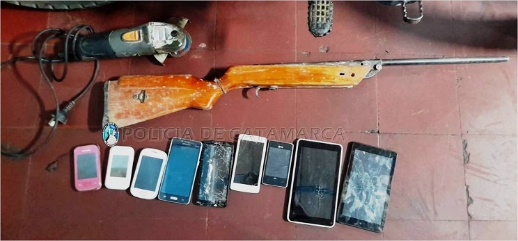 Asimismo, a las 14:40, mientras el personal policial interviniente inspeccionaba una de las viviendas ubicada en el barrio Estación Norte S/N° propiedad de una familia de apellido Zarate encontró un rifle aire comprimido, ocho teléfonos celulares de distintas marcas y modelos, una tablet marca Voxson y una amoladora, que quedaron en calidad de secuestro, ya que contaban con similares características a elementos sustraídos días atrás y de los cuales obraban denuncias en la Comisaría.