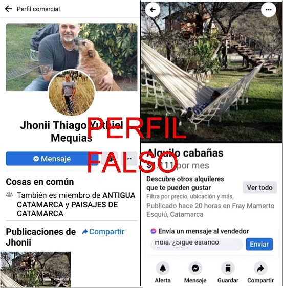 Ø Cuando las personas desean tomarse un descanso, principalmente oriundos de otras provincias o del interior provincial, buscan información por las redes sociales, encuentran en algunos grupos de “compra/venta Catamarca” en la red social Facebook publicaciones del rubro turístico sobre cabañas para alquiler, inician un contacto con el número telefónico aportado por los estafadores a través del servicio de mensajería WhatsApp, y tomando desprevenidos a sus víctimas, piden por el alquiler de esas cabañas o casas de campo un adelanto de dinero que en ocasiones equivale hasta el 50% del valor final, el que tiene que ser transferido a un CBU/CVU de una cuenta bancaria personal, no empresarial, y al acreditarse el dinero acordado los ciber estafadores concluyen la maniobra fraudulenta y bloquean a sus víctimas.